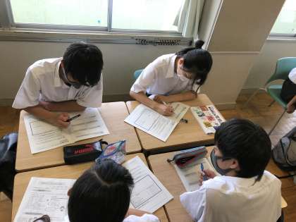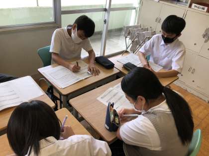9月に行われる職場訪問に向けて、ハローワークの笠先生にお越しいただき、マナー講座を行っていただきました。挨拶や返事の大切さや礼の意味などたくさんのことを教わりました。その後、班で学習したことを振り返り、共有しました。