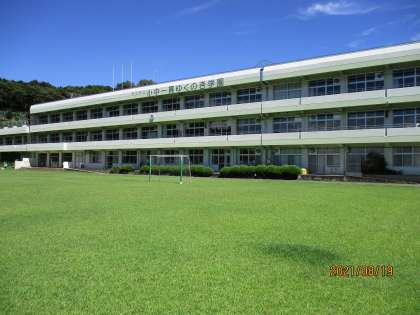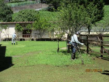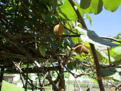 第一校庭の芝生は今、まぶしいほどの緑が青空にマッチしています。そんな中、用務主事の皆様は、ヤギ小屋周辺の雑草を刈ってくださっていました。キウイも大きくなりつつあります。(この写真を撮っている間、ヤギたちは餌をくれるのかと勘違いし、思いっきり背筋を伸ばしていました。)