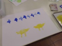 絵の具の海を超えて、えのぐじま発見。試し用の紙に絵の具での表現方法をたくさん試し...