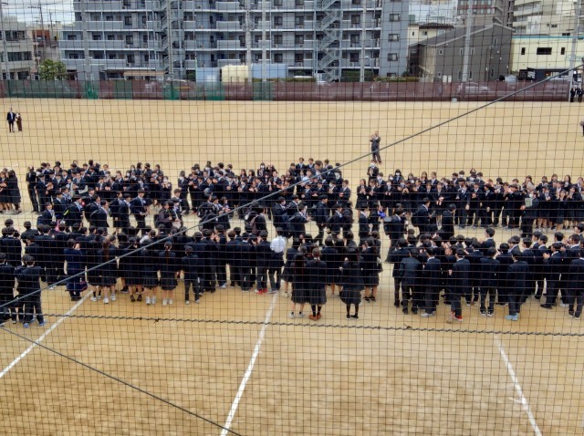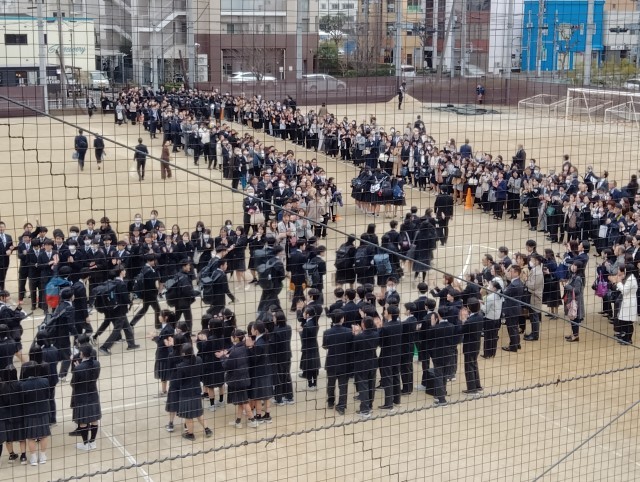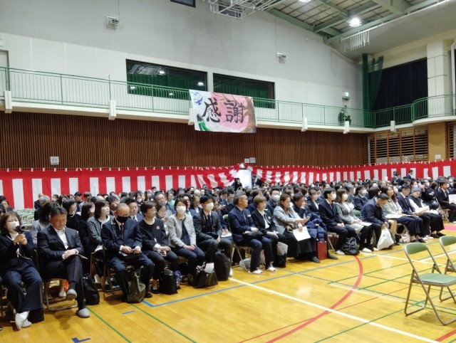 大方の雨の予報を見事に覆し、式の途中からは晴れ間ものぞく、正に晴れの舞台が調いました! 保護者様、本日は誠におめでとうございます。そして3年生諸君、本当におめでとう! 会場の後方からは、1・2年生が作った【感謝】の横断幕がやさしく式を見守ってくれました。