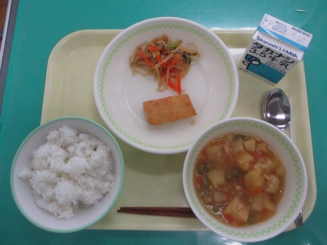 本日の給食です。ごはん、牛乳、じゃがいものそぼろ煮、いかの香味焼き、野菜と油揚げ...
