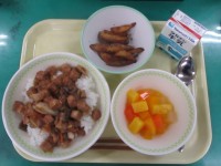本日の給食です。 厚揚げの回鍋肉丼、牛乳、青のりポテト、夕焼けゼリーポンチ...
