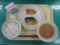 本日の給食です。ごはん、牛乳、さばのカレー焼き、肉野菜炒め、大根となめこのみ...