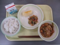 本日の給食です。 ごはん、牛乳、肉豆腐、大根とキャベツのゆかり和え、菊花み...