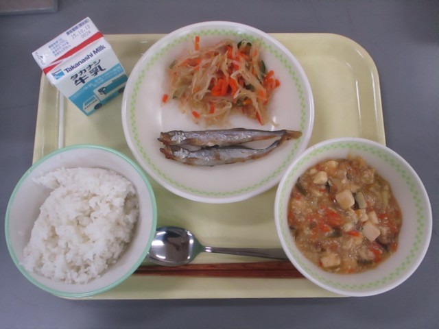 ごはん、牛乳、ピリ辛麻婆豆腐、焼きししゃも、バンサンスー でした。