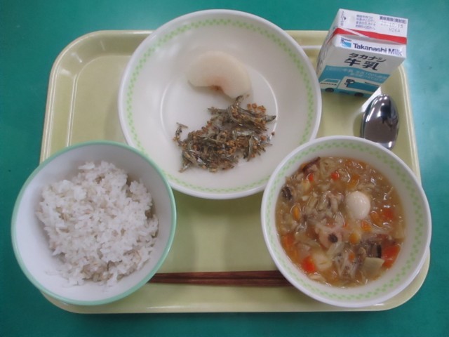 押麦入りごはん、牛乳、八宝菜、いりこの甘辛和え、梨 でした。
