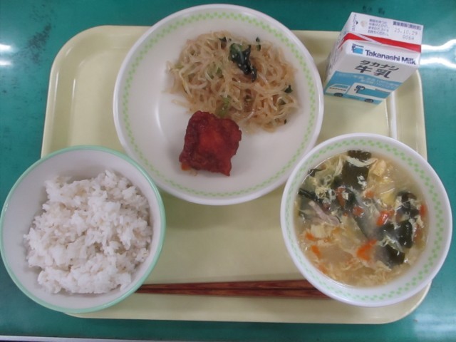 麦ごはん、牛乳、ヤンニョムチキン、小松菜と春雨のナムル、たまご入りトックスープ でした。