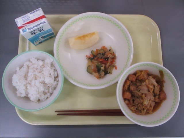 麦ごはん、牛乳、豚キムたく炒め、華風和え、りんご でした。