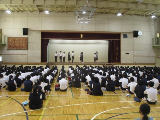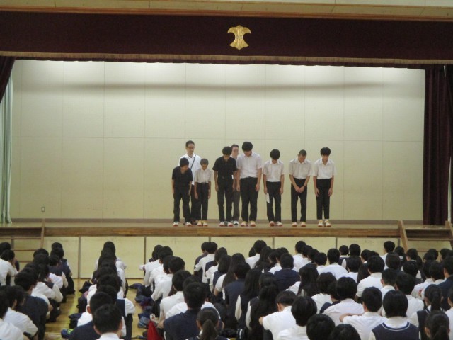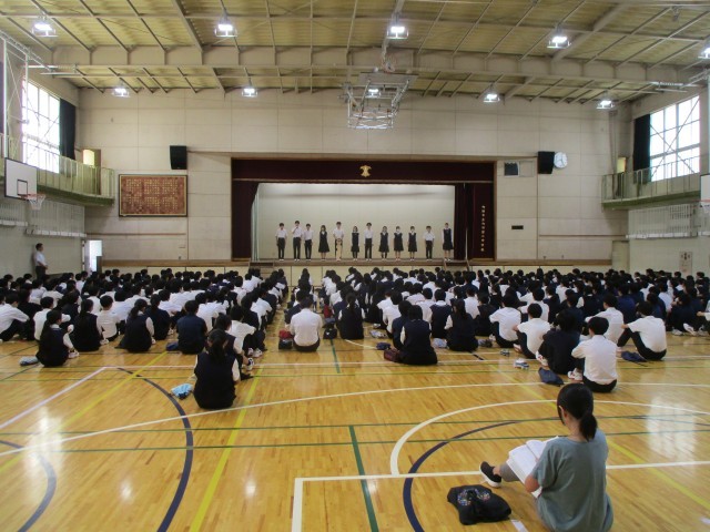 生徒会朝礼で前生徒会役員から新生徒会役員へのカギの受け渡しを行いました。
