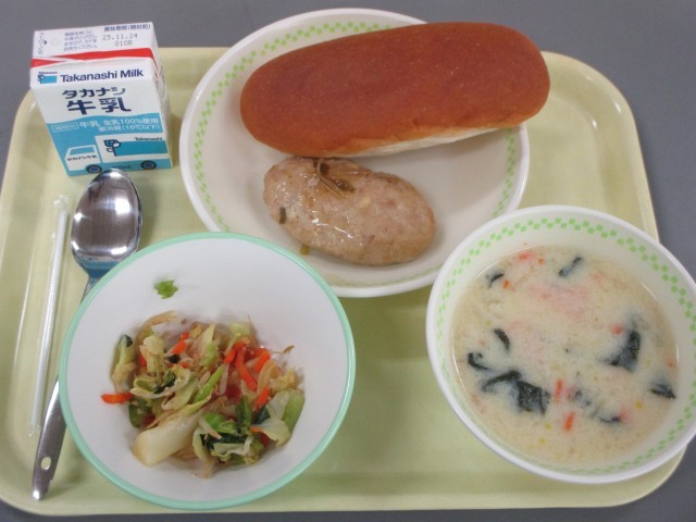 ミルクコッペパン、牛乳、照り焼きハンバーグ、町田産キャベツのレモン和え、豆乳スープ でした。