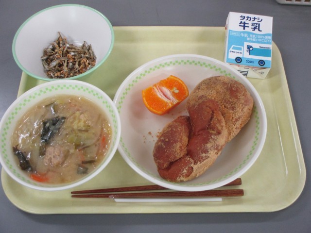 きなこ揚げパン、牛乳、いりこの甘辛和え、まち☆ベジと肉団子のみそスープ、柑橘(ポンカン) でした。