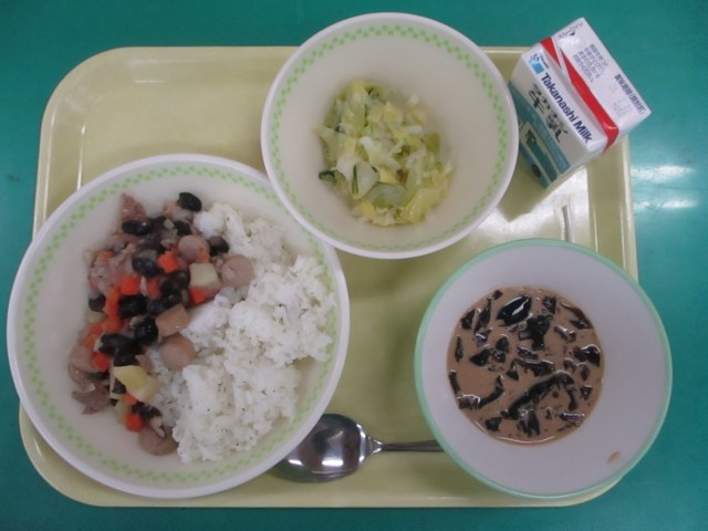 パセリライス、牛乳、フェイジョアーダ(豆と肉の煮込み)、グリーンサラダ、コーヒーゼリー でした。