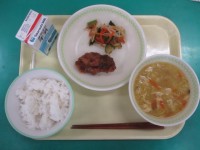 本日の給食です。ごはん、牛乳、油淋鶏、中華和え、中華風コーンスープ でした。