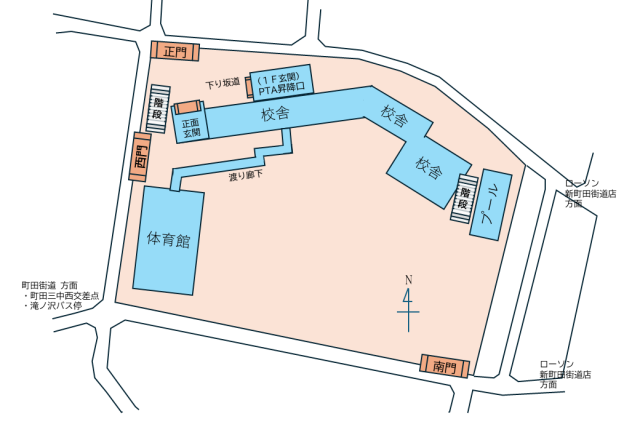 授業参観も、説明会同様、入口・受付はPTA玄関です。正門から入りましたら左に曲がり、坂を少し降りた1階玄関からお入りください。