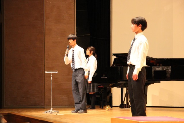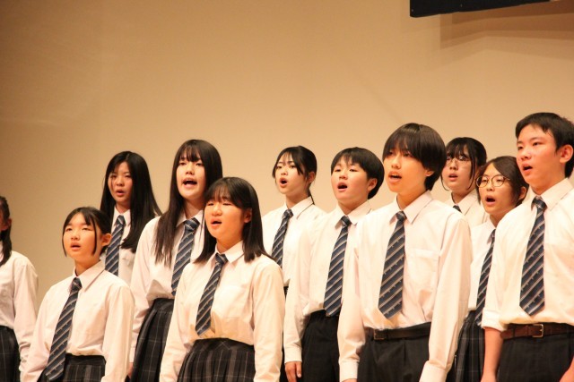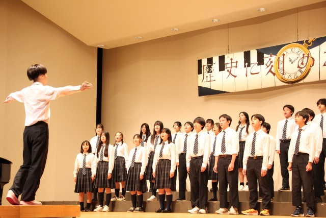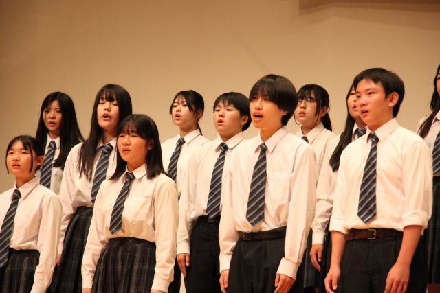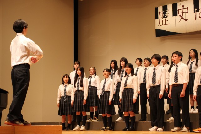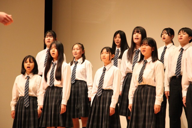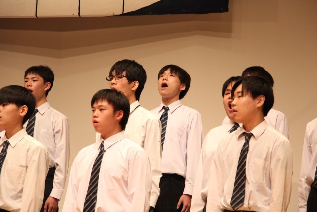 3年C組の合唱です。どのクラスも生徒たちが話し合って自分達が歌う自由曲を選びます。3-Cは、重厚な課題曲に対比させて、軽やかに美しいハーモニーを聴かせる自由曲を選択しました。この曲は途中でフラット2つからシャープ5つに転調します。雑味が混じるとすぐにわかってしまう、勢いでごまかすことができない難曲でしたが、見事なハーモニーを響かせていました。
