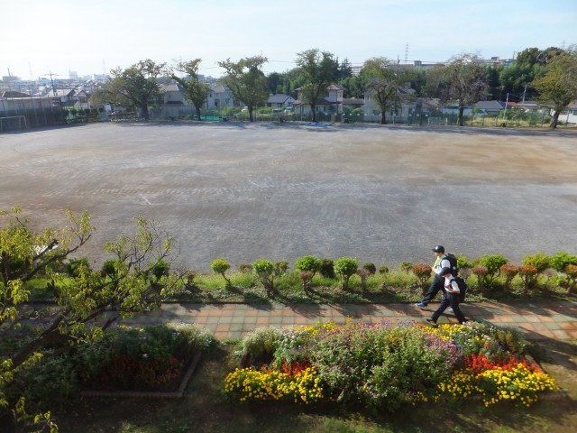 手入れされた美しい花壇の前を、教室に向かっている三中生です。