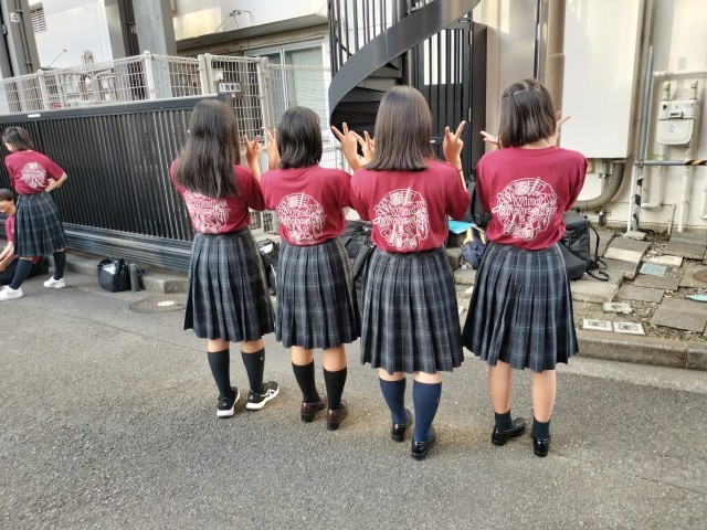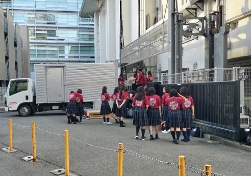 合唱コンクールが全て終わり、保護者、御来賓の皆様や一般生徒が帰った後、各係の生徒達がホールの撤収作業を行いました。写真は、一番最後まで残って、楽器・機材の搬出作業をする吹奏楽部の生徒達です。今回作成した、お揃いの吹部Tシャツを着て記念の一枚。自分たちがデザインした背中のイラストが芸術的です。