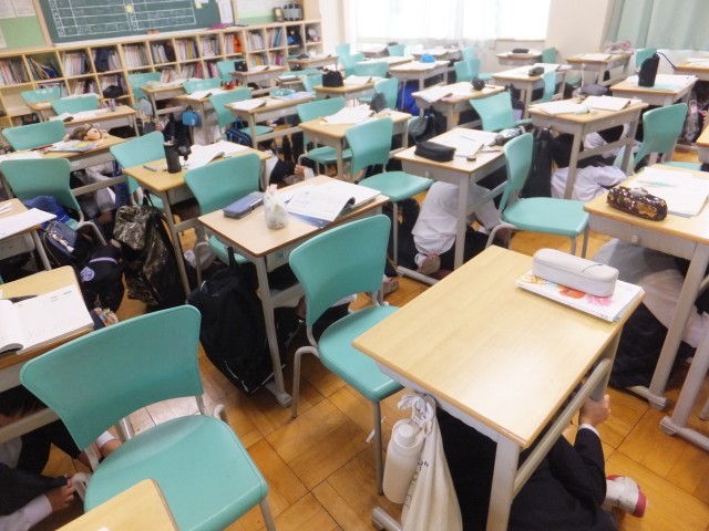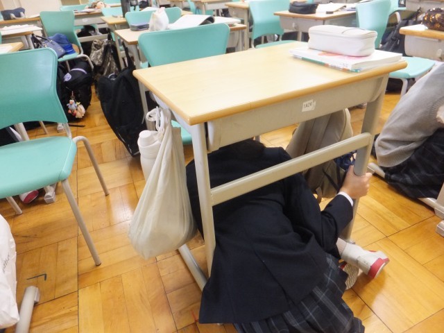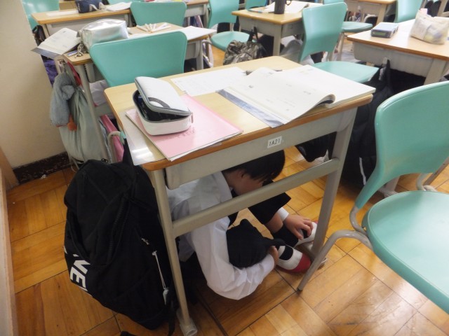 地震で揺れがあるときは、机の下に頭を入れて頭部を守ります。