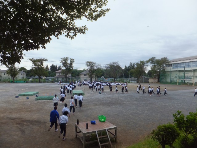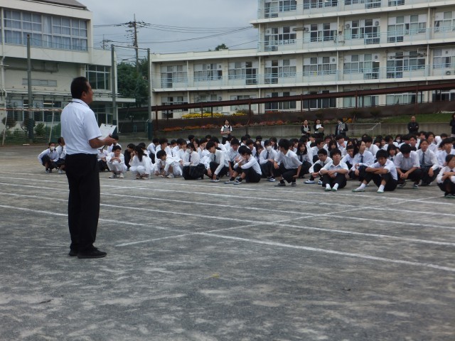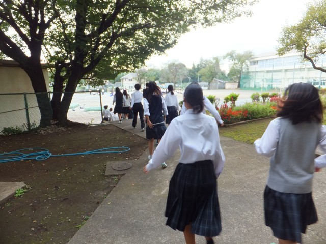 揺れが収まった後、火災が発生したとの放送があり、直ちに校庭へ避難します。