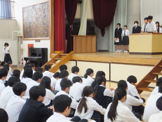 続いて、各委員会委員長の認証授与式の後、生徒会長、各委員長から「後期活動の抱負と活動計画」について話がありました。