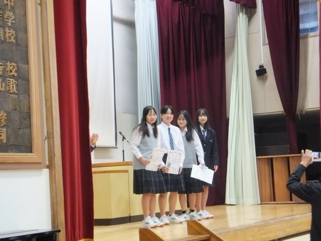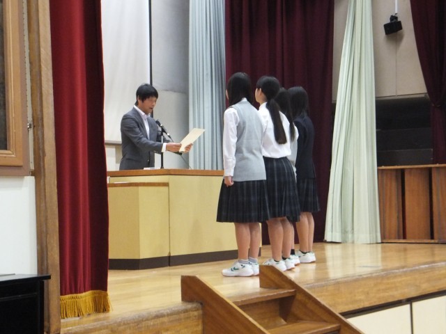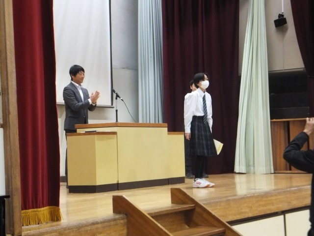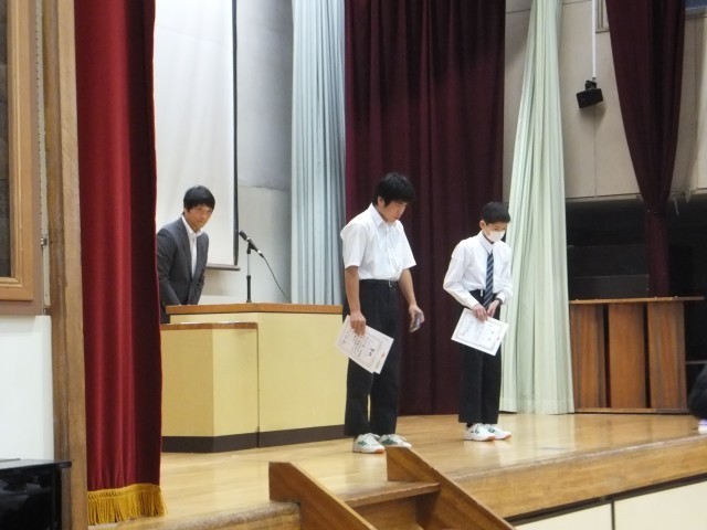 校長の話の後、9月と10月に行われた各大会(剣道部、卓球部、バドミントン部)の表彰を行いました。