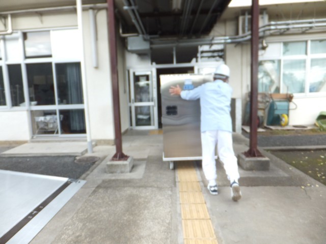 ちょうどこの時間、給食のトラックが到着し、とても重たいコンテナを運んでいました。