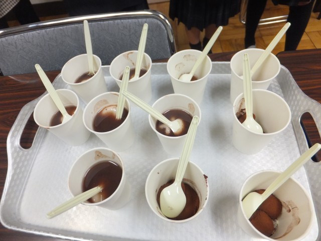 調理室で「白玉お汁粉」「チョコもち」を作りました。