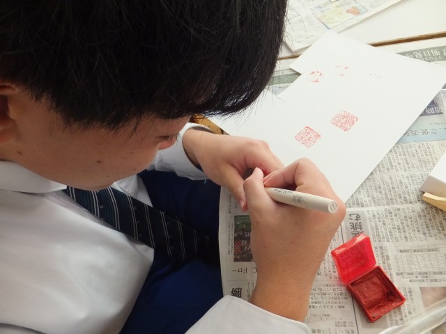 中には、「ピーマン」の形を彫って印を作っている三中生もいて、発想の豊かさに驚きます。