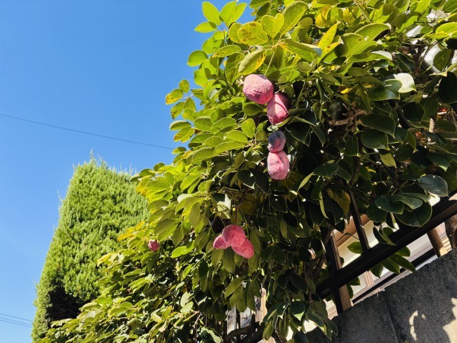 アケビに似ていますが、アケビとは異なり常緑性で、実は熟しても割れないそうです。