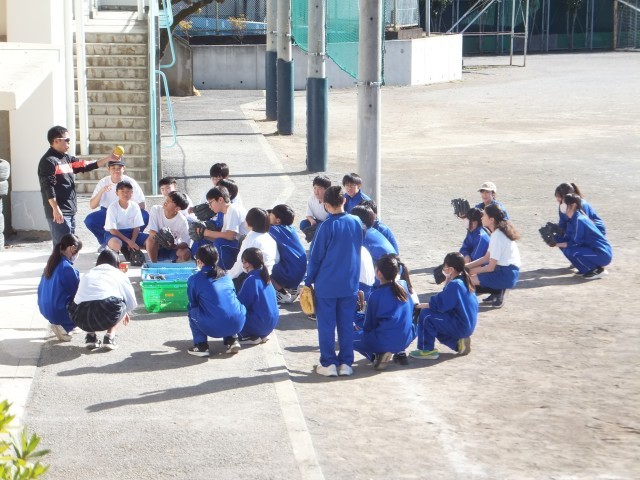 最後の写真は、校庭でソフトボールの説明を受けている1年生の保健体育の授業です。