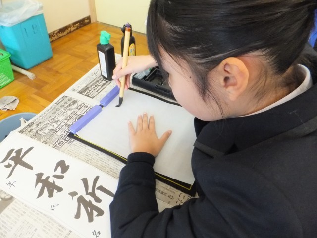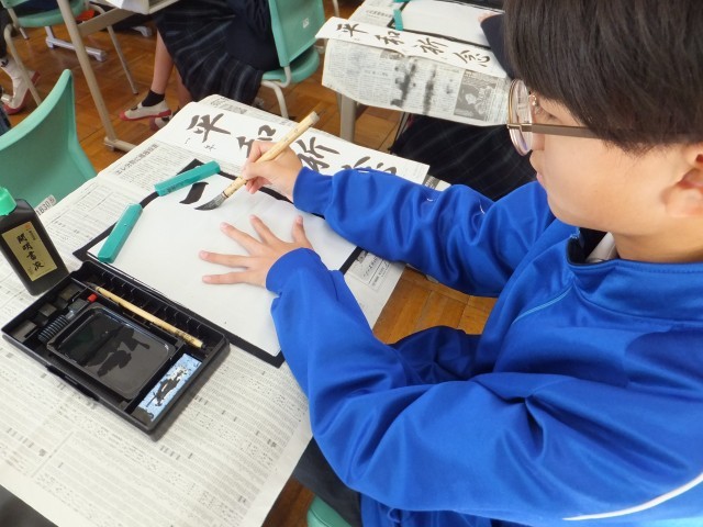 1年生、書写(毛筆)の授業です。