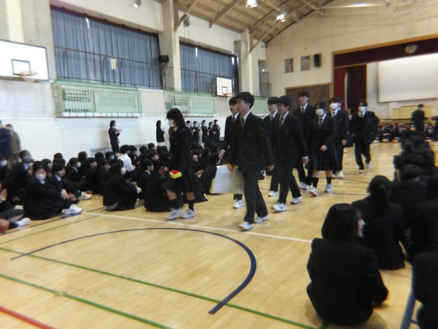始業式の後、全校生徒は体育館にそのまま残って、「3年生を応援する会」が始まりました。