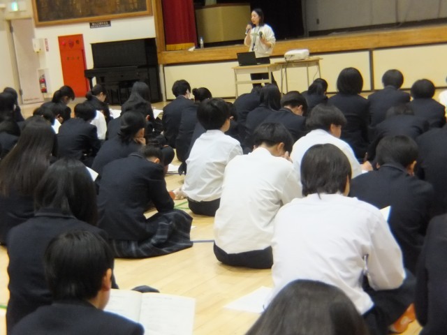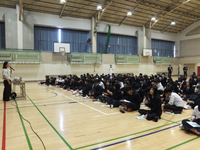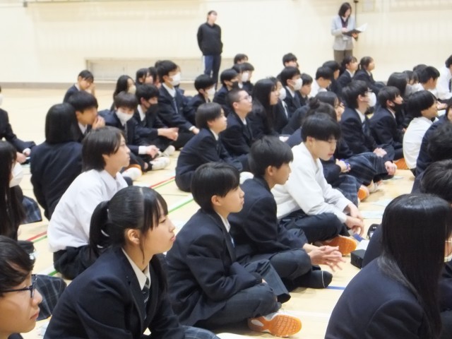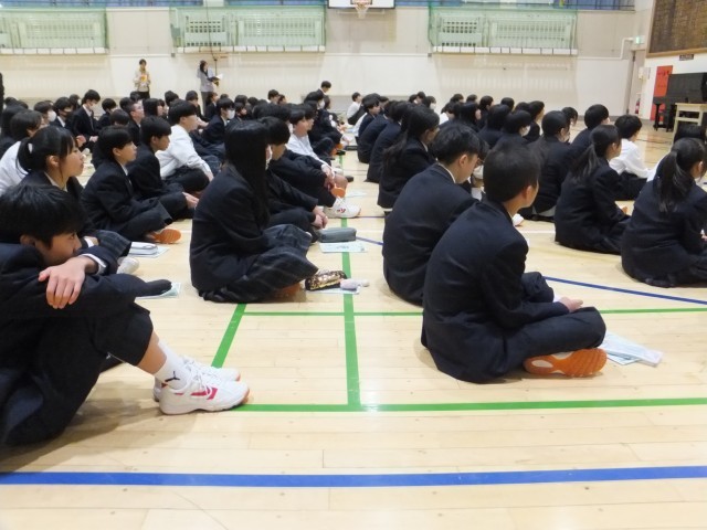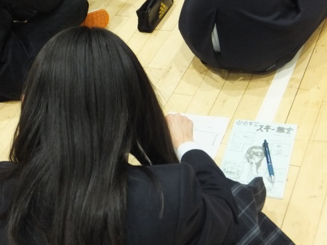 1年生は体育館で、明日から出かける「移動教室(スキー教室)」の最後の確認をしていました。