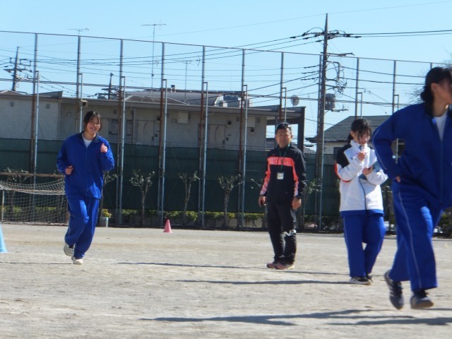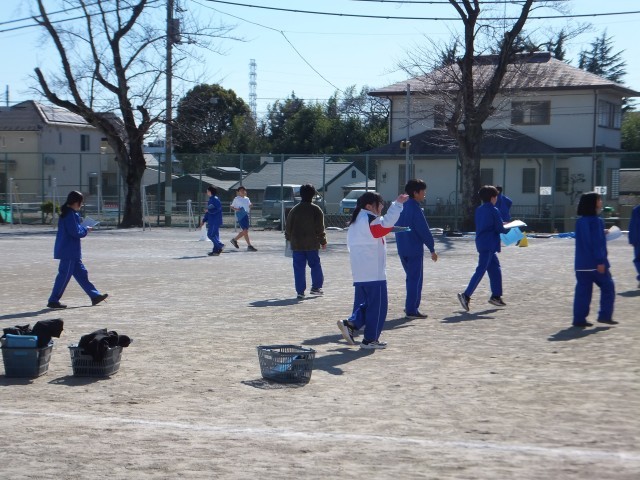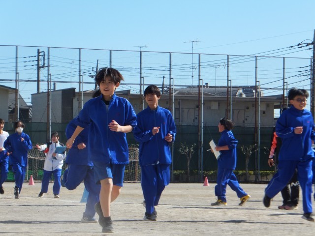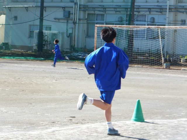 2月3日(火)、真っ青な空ときれいな梅の校庭では、1年生が持久走に取り組んでいました。