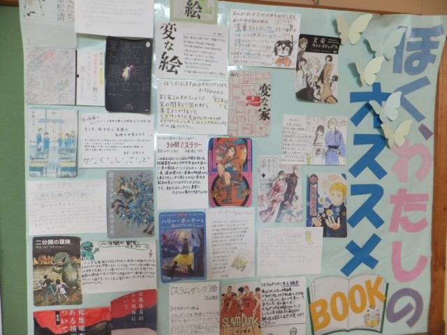 1年生の音楽の授業と朝の登校時の様子、そして「おすすめ本」の紹介です。