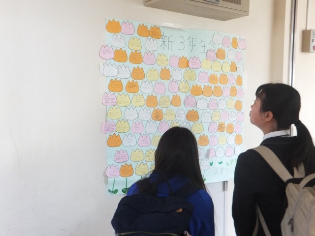 のメッセージが、それぞれの在校生のフロアの廊下に掲示されていました。