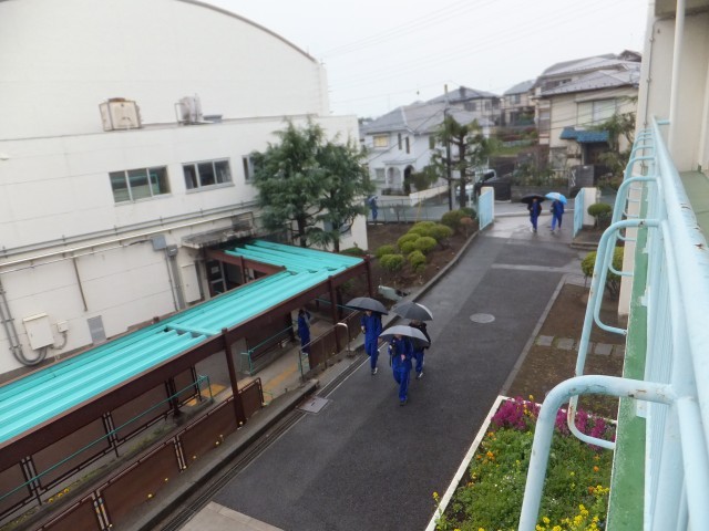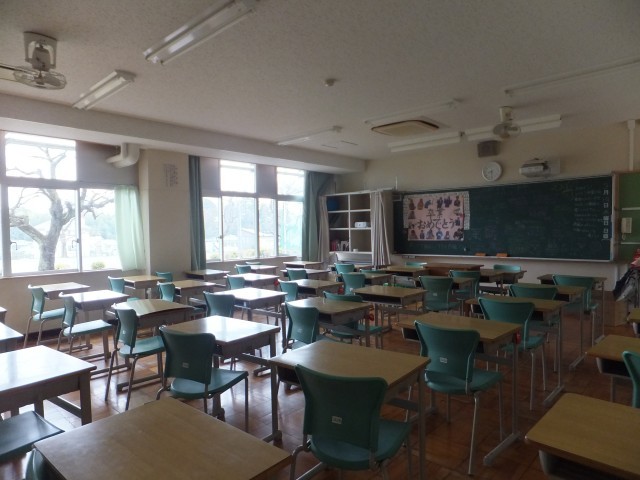 写真は、朝の登校風景と卒業生の使用した教室です。