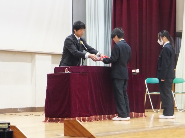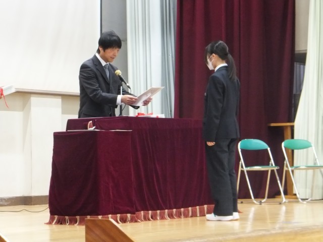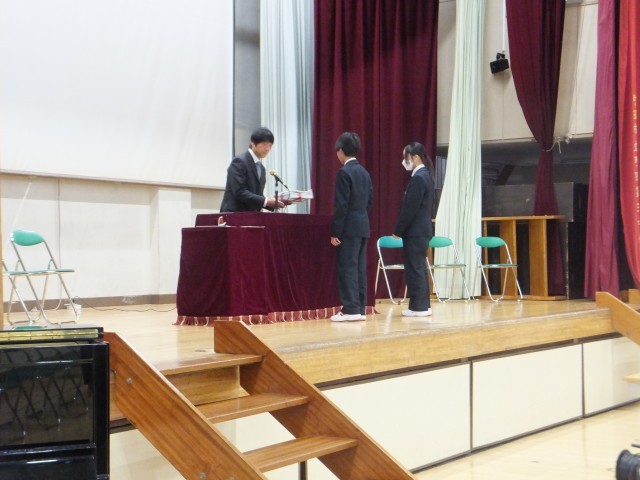 校歌を歌い、終了証を各学年代表生徒の授与いたしました。