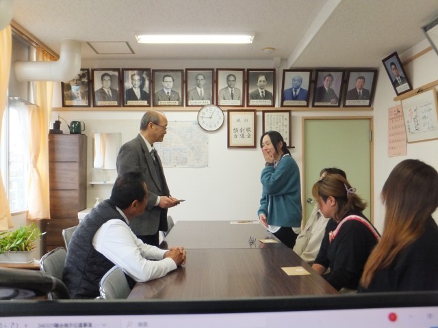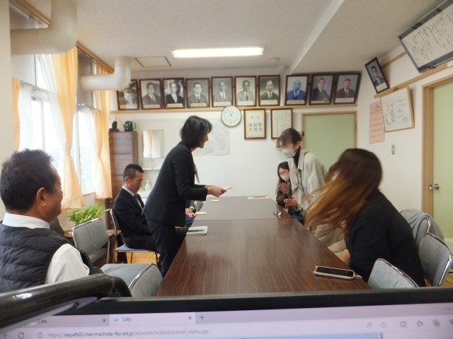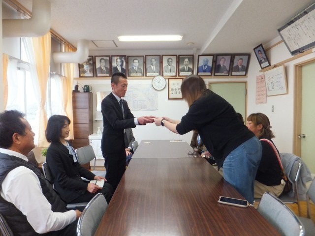 3月25日(水)離任式修了後、三中サポーターの代表者から離任者全員に贈り物をいただきました。