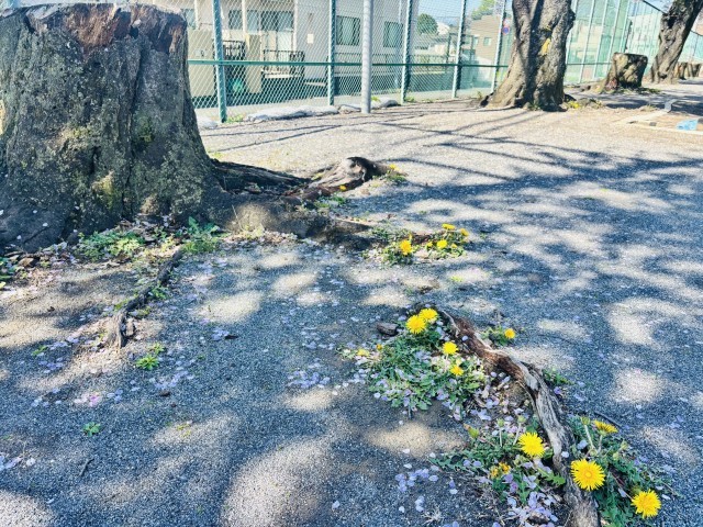 桜の根っこにそって、たくましくタンポポも咲いています。