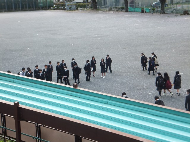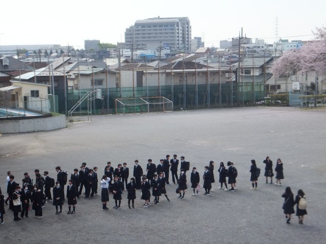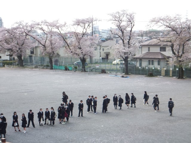 新2年生、新3年生の列にそれぞれ並び、学級編成が記載しているプリントが配布されるのを待っています。