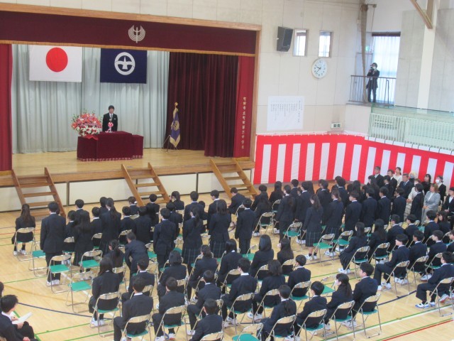 新入生が体育館式場に入場し、午前9時30分入学式は始まりました。