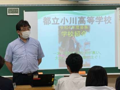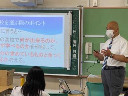 「高校の先生の話を聞く会2」 公開日 2021/07/15 更新日 2021/07/15 お知らせ 生徒は前半と後半に別れ、6つの高校から2つの高校を選択し説明を受けます。緊張感をもって聞き入る姿が印象的でした。