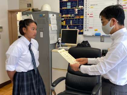 本日は、「終業式」となります。校長先生から、一学期の総括、多様性(ダイバシティ)、平和についての※講話がありました。(写真上段) 剣道部の生徒の活躍が表彰されました。(写真中段) 週学活が終わり、顧問の先生に通知表を持って報告してます。(写真下段)
