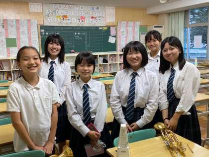 9月3日(金)「吹奏楽部1年生」 公開日 2021/09/06 更新日 2021/09/06 お知らせ 8月の東京都吹奏楽コンクール金賞で、少し自信をつけた1年生。「頑張ったね!」と声を掛けると、「緊張で口から心臓が飛び出しそうになりました。」と答えていました。笑顔が素敵です。