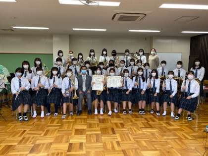 写真は、夏休みの東京都吹奏楽コンクール「金賞」受賞をお祝いした記念撮影です。