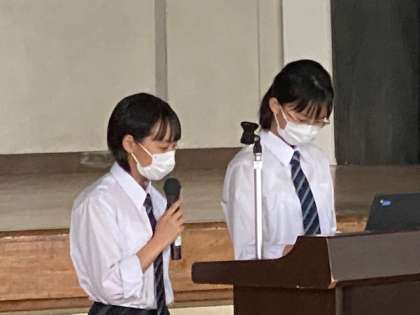 写真は、授業参観後の学校説明会の様子です。本校の教育活動の特色や指導方針について、各分掌主任から説明がありました。写真下段は、生徒会による、パワーポイントを使い部活動について丁寧に説明をする様子です。