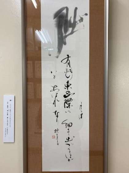 10月1日(金)「職員ギャラリー」 公開日 2021/10/02 更新日 2021/10/02 お知らせ 写真は、職員室前に展示された「書」です。 月は 有明の 東 の山際に 細くて出づるほど いとあはれなし (清少納言『枕草子』)