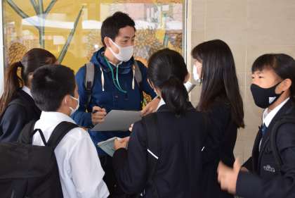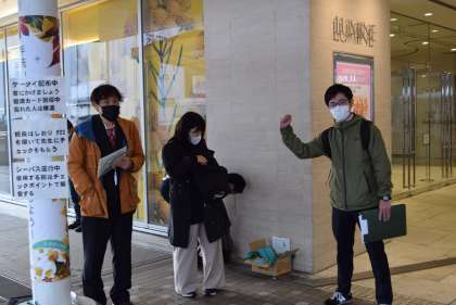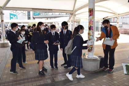 1学年「横浜校外学習」出発チェックとなります。JR横浜線町田駅ルミネ前オブジェ付近でのチェックの様子です。「仲間とともに横浜へ!全力で楽しもう!!」