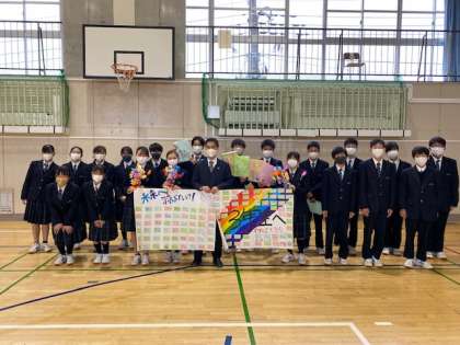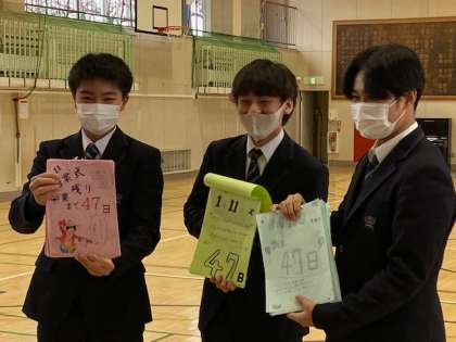 1月11日(火)「始業式」 公開日 2022/01/11 更新日 2022/01/11 お知らせ 全国的にオミクロン株が急激に増えています。職員打合せでも、感染予防対策の徹底について注意換気がなされました。ご家庭でも、発熱、体調不良の場合は登校させないようお願いいたします。 写真は、「3年生を励ます会」の様子です。1.2年生から、心のこもった贈り物が渡されました。